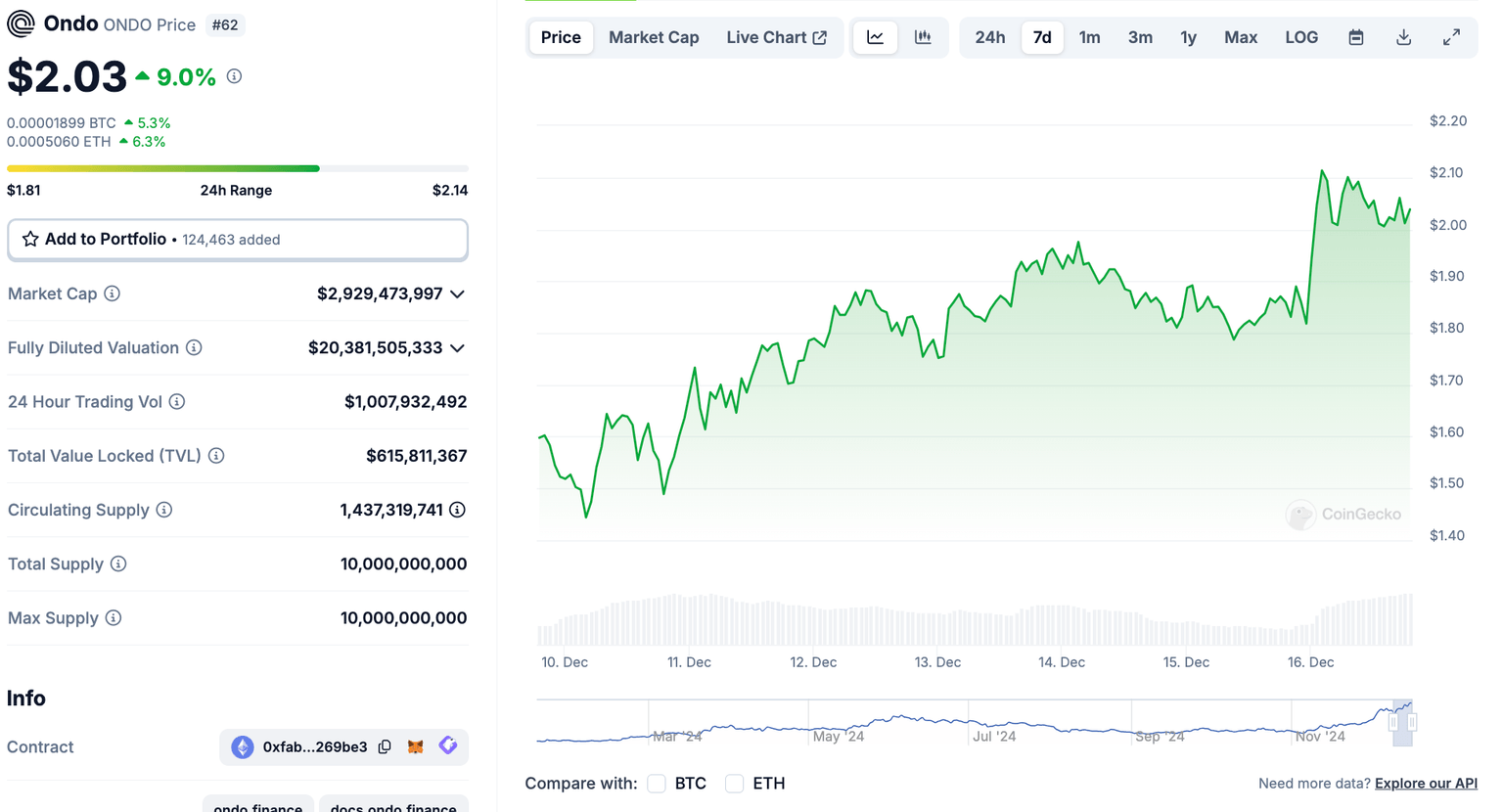 Acción del precio de Ondo Finance (ONDO), 16 de diciembre de 2024 | Fuente: Coingecko