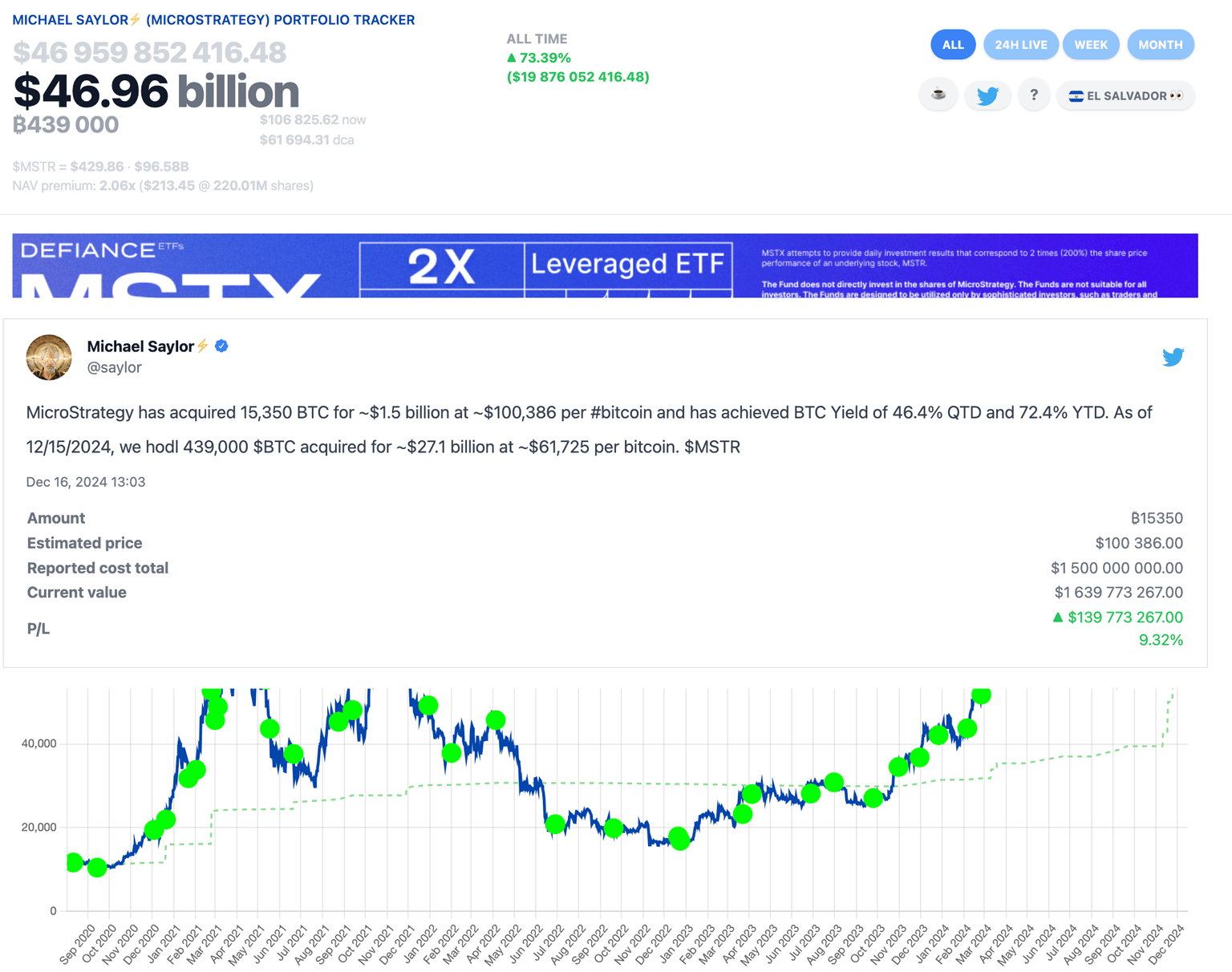 Tenencias totales de Bitcoin (BTC) de MicroStrategy al 16 de diciembre de 2024 | Fuente: SaylorTracker.com