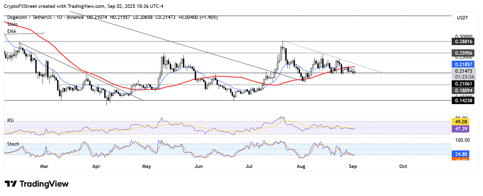 DOGE se está negociando a 0.214$ en el momento de la publicación después de rebotar del soporte de 0.210$. Si los toros mantienen este nivel de soporte, el principal memecoin podría probar una resistencia de línea de tendencia descendente que se extiende desde el 21 de julio.