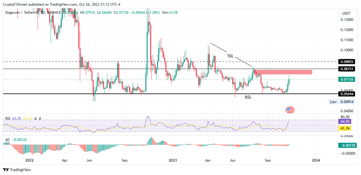 El precio de Dogecoin (DOGE) ha subido casi un 25% esta semana después de pivotar alrededor del suelo del soporte 0.0569$. El empuje hacia el norte está vigorizado por el impulso alcista, sin signos de detenerse ya que el apetito de venta de los inversores permanece bajo control.