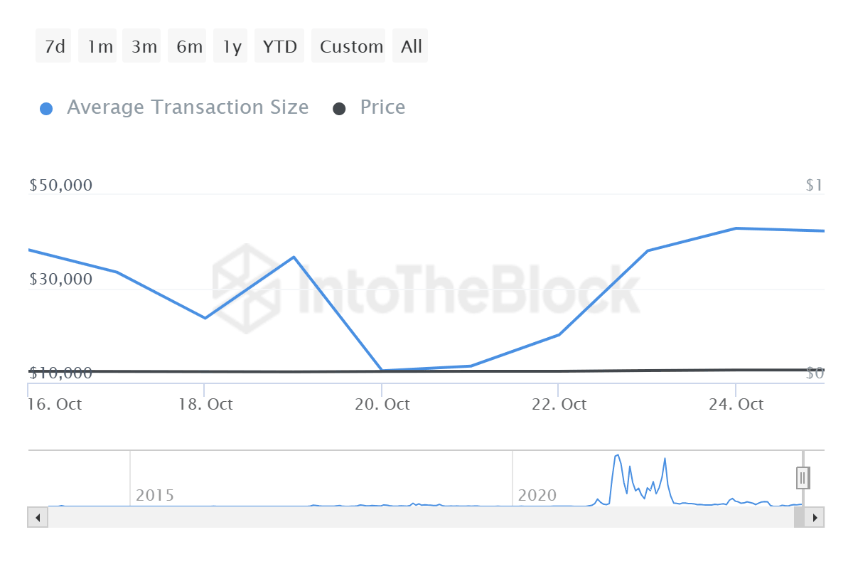 El aumento constante en el tamaño promedio de las transacciones también corrobora la perspectiva alcista, con datos que muestran un aumento del 24% en los últimos siete días, pasando de 12.552$ a 42.327$ al momento de escribir. Esta métrica muestra cuánto están gastando los operadores de DOGE, y el aumento del 24% sugiere que debería esperarse más volatilidad del precio de Dogecoin. Esto añade credibilidad al potencial de ganancias del 10% para el precio de Dogecoin.