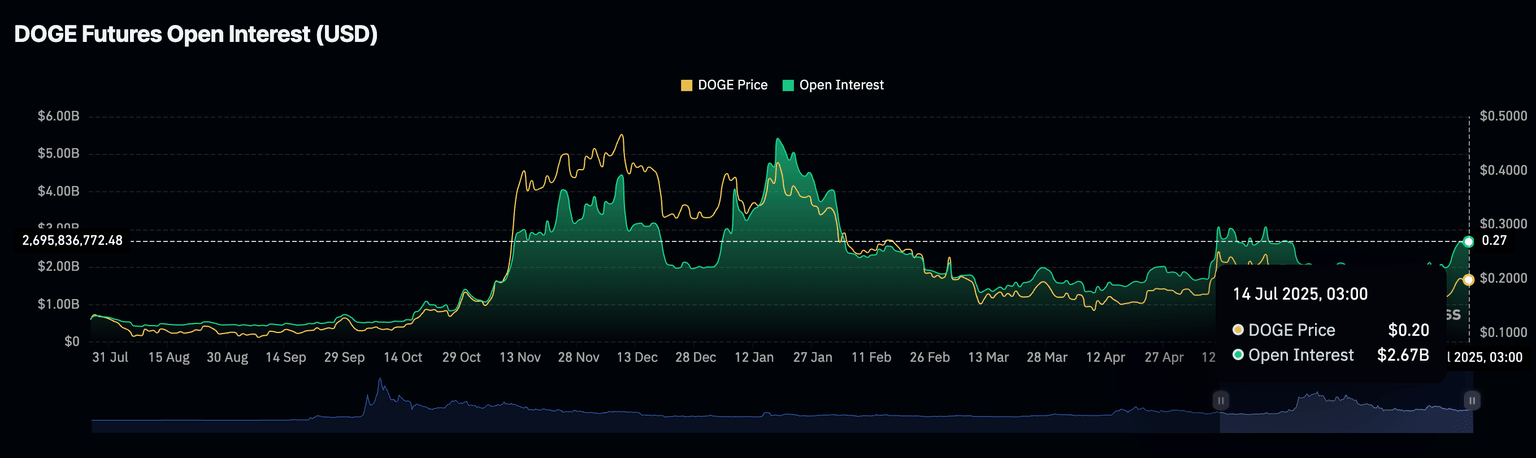 Aún así, el interés en Dogecoin sigue siendo relativamente alto, como lo demuestra el Interés Abierto (OI) de los contratos de futuros, que se sitúa en 2.67 mil millones de dólares, en comparación con el valor más bajo de OI de 1.64 mil millones de dólares en junio.