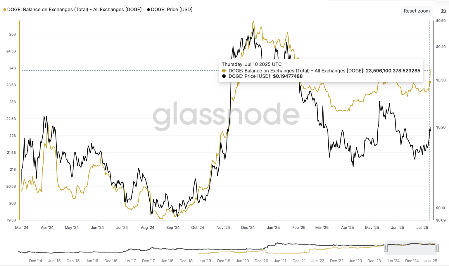 La métrica de Balance en Exchanges destaca un aumento brusco en el número de tokens DOGE en los intercambios, pasando de aproximadamente 23.2 mil millones a 23.5 mil millones desde mediados de junio.