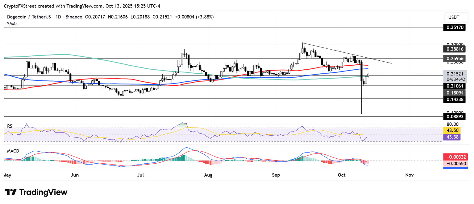 Tras el colapso del mercado cripto el viernes, DOGE encontró soporte en 0,180$ antes de realizar una recuperación por encima del nivel de 0,210$, que está reforzado por la media móvil simple (SMA) de 200 días.