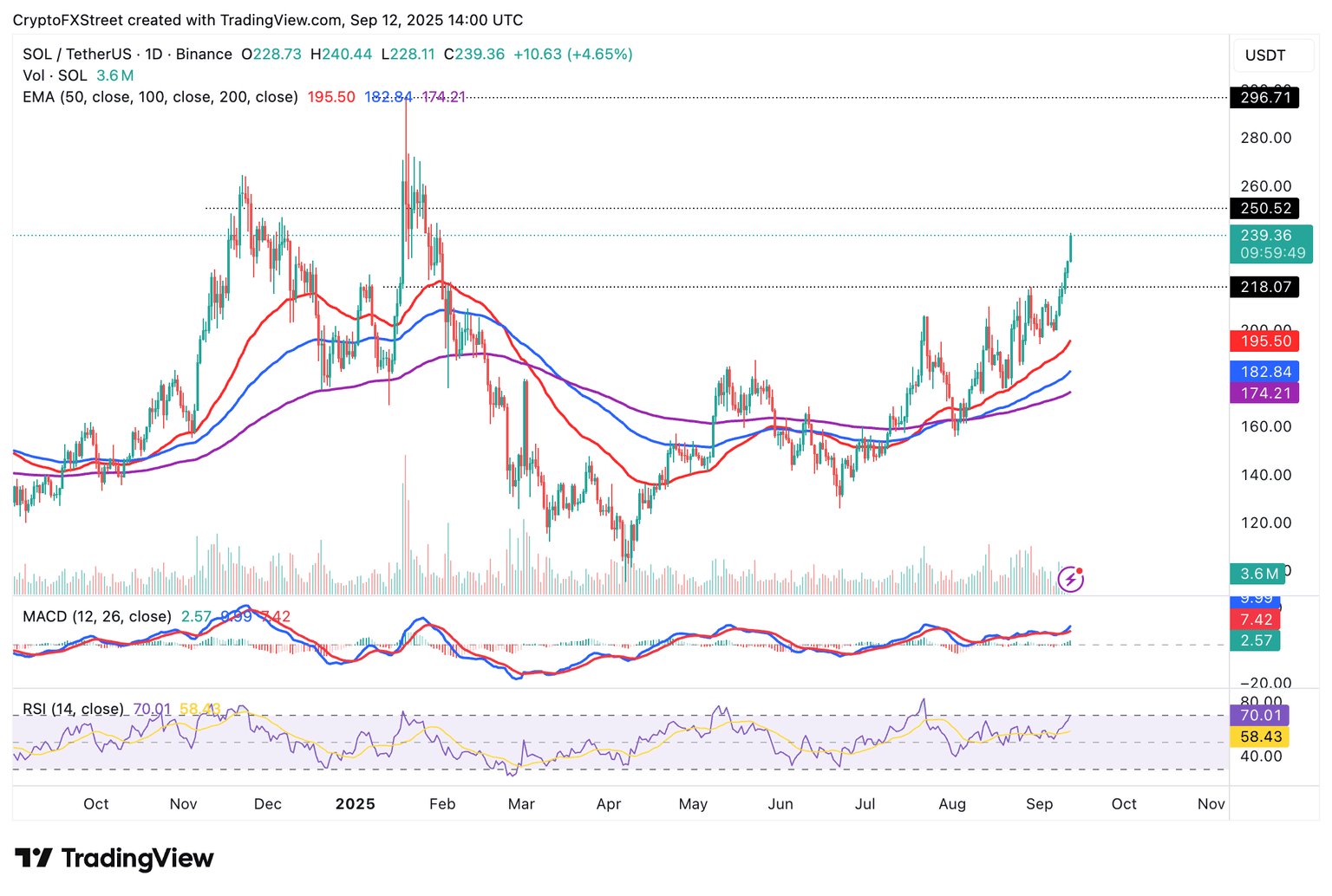 Solana ha aumentado un 53% desde principios de agosto, intercambiándose a 239$ en el momento de escribir el viernes. El token mantiene una estructura técnica robusta, posicionándose significativamente por encima de las medias móviles clave, incluida la media móvil exponencial (EMA) de 50 días en 195$, la EMA de 100 días en 182$ y la EMA de 200 días en 274$.