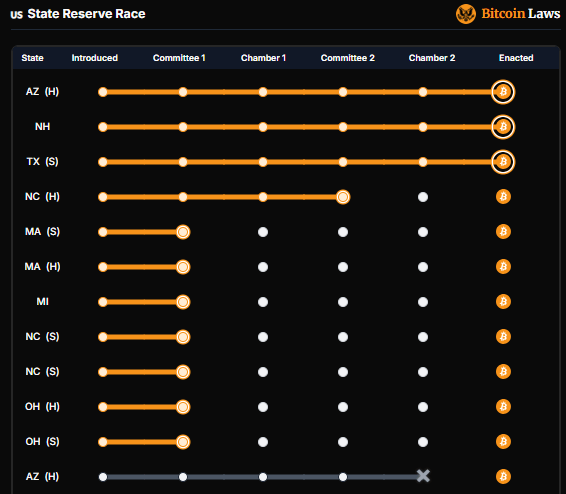 Aparte de la administración de Trump trabajando en su Reserva Estratégica de Bitcoin, muchos estados de EE.UU. se unieron a la carrera por sus propias reservas de Bitcoin, como se muestra en el gráfico a continuación.