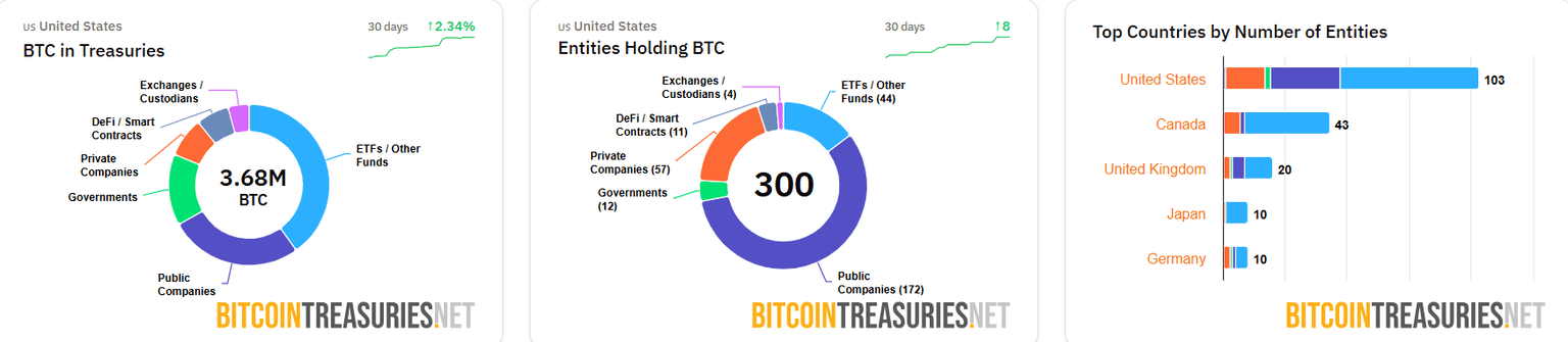 En el lado institucional, EE.UU. es el líder entre los países por número de entidades, con más de 3.68 millones en tesorerías de BTC y 300 empresas (públicas y privadas), superando a países como Canadá y el Reino Unido, como se muestra en el gráfico a continuación.
