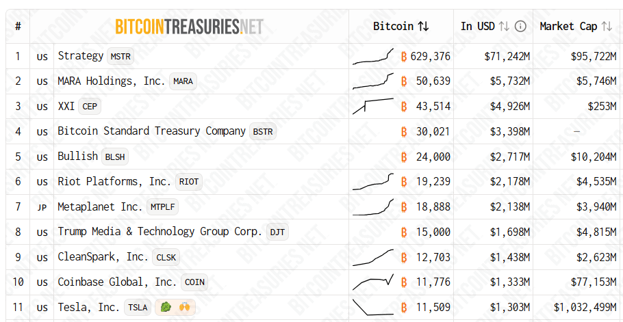 Entre las empresas corporativas con sede en EE.UU., la estrategia de Michael Saylor, anteriormente MicroStrategy, actualmente posee 629.376 BTC, seguida por MARA Holding con 50.639 BTC, según datos de BitcionTreasuried.Net.