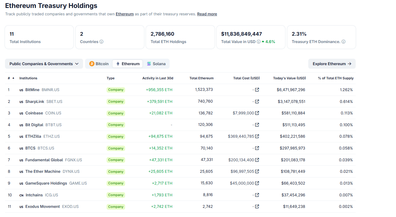 Aparte de que las empresas y el gobierno de EE.UU. aumentan sus tenencias de BTC. Los datos de CoinGecko a continuación muestran que la lista de empresas públicas que poseen Ethereum también está en aumento. Las once empresas rastreadas por CoinGecko poseen el 2.3% del suministro de Ether, y más de 2.78 millones. 10 de las 11 empresas son de EE.UU. y han acumulado más tokens de Ethereum, incluso cuando los inversores minoristas continúan tomando ganancias, en los últimos treinta días.