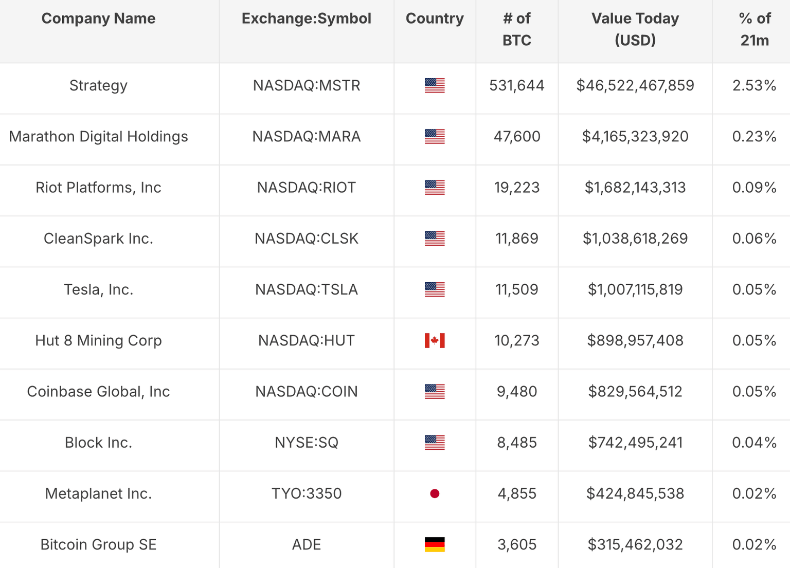 Las diez principales empresas de tesorería de Bitcoin públicamente conocidas controlan el 3% del suministro