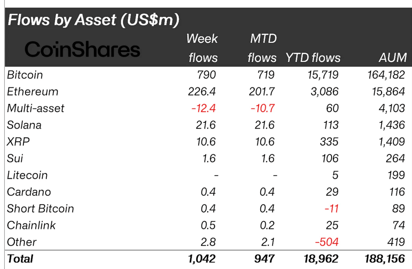 CoinShares informó el lunes que las entradas en productos de inversión digitales relacionados con BTC promediaron 790 millones de dólares la semana pasada. Las entradas acumuladas totalizaron aproximadamente 1.030 millones de dólares, lo que aceleró los activos bajo gestión a 188 mil millones de dólares.