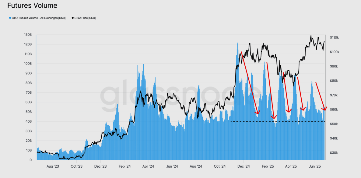 Glassnode declaró que los volúmenes al contado se mantienen en 7.700 millones de dólares a pesar del aumento del Bitcoin a 111.000$, lo que es considerablemente más bajo que los volúmenes de rallies anteriores en el segundo y cuarto trimestre de 2024.
