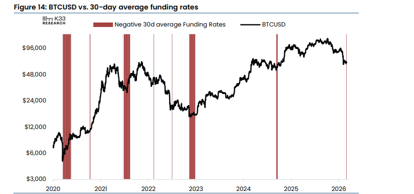 - K33 afirmó que el BTC está muy sobrevendido, citando tasas de financiación negativas raras y fuertes entradas de ETF como señales de un rebote.