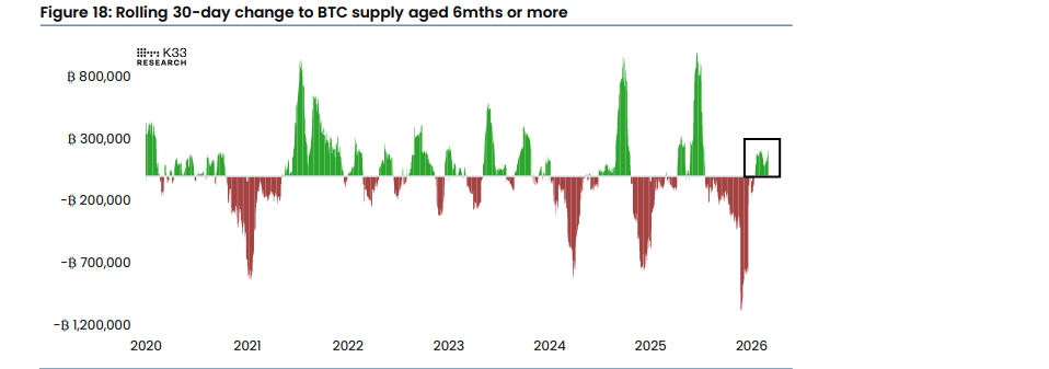 Datos adicionales sugieren que los grandes tenedores de Bitcoin han reducido la presión de venta. En el último mes, la oferta de BTC con seis meses o más de antigüedad ha aumentado, invirtiendo la fuerte contracción registrada en el cuarto trimestre de 2025.