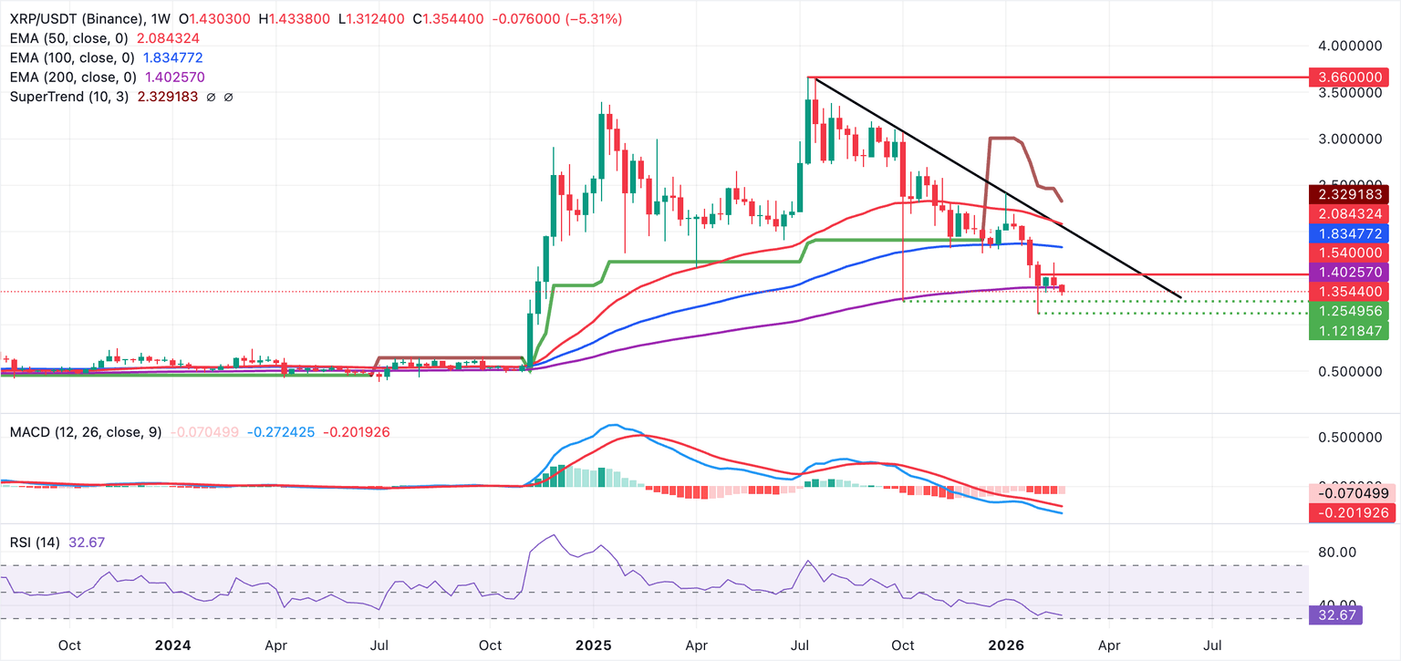 Mientras tanto, XRP se mantiene por debajo de la media móvil exponencial (EMA) de 50 semanas, así como de las EMAs de 100 y 200 semanas, todas agrupadas entre 1.40$ y 2.08$, subrayando una tendencia bajista madura.