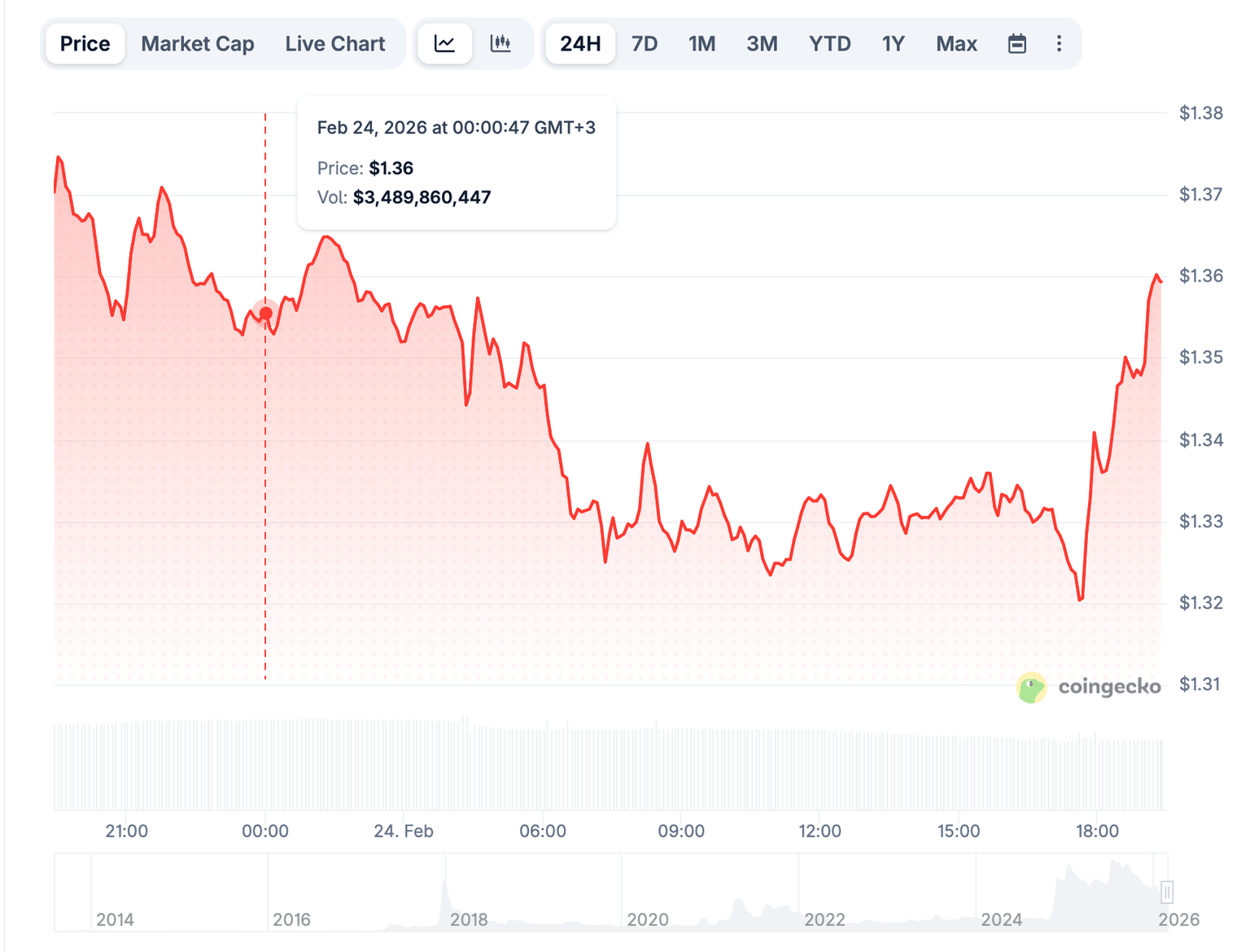 Mientras el precio se mantenga por debajo de estas barreras, los repuntes son vulnerables a un suministro renovado. A la baja, el soporte inmediato se observa en el mínimo reciente alrededor de 1.33$, con una ruptura exponiendo el próximo enfoque a la baja cerca de 1.20$ y luego 1.05$.