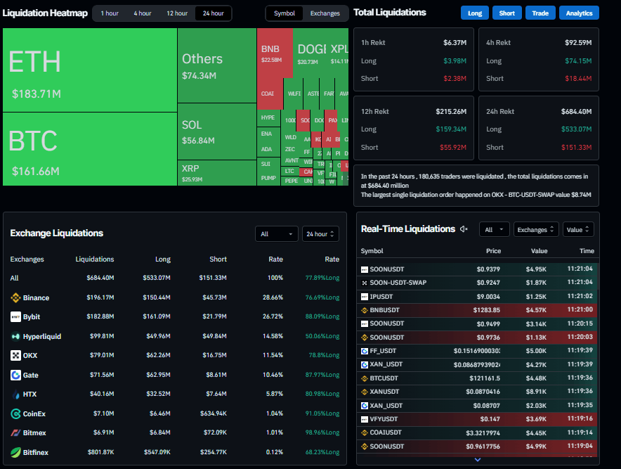 - Los datos de CoinGlass muestran que se eliminaron más de 680 millones de dólares en posiciones apalancadas en los mercados de criptomonedas en las últimas 24 horas.