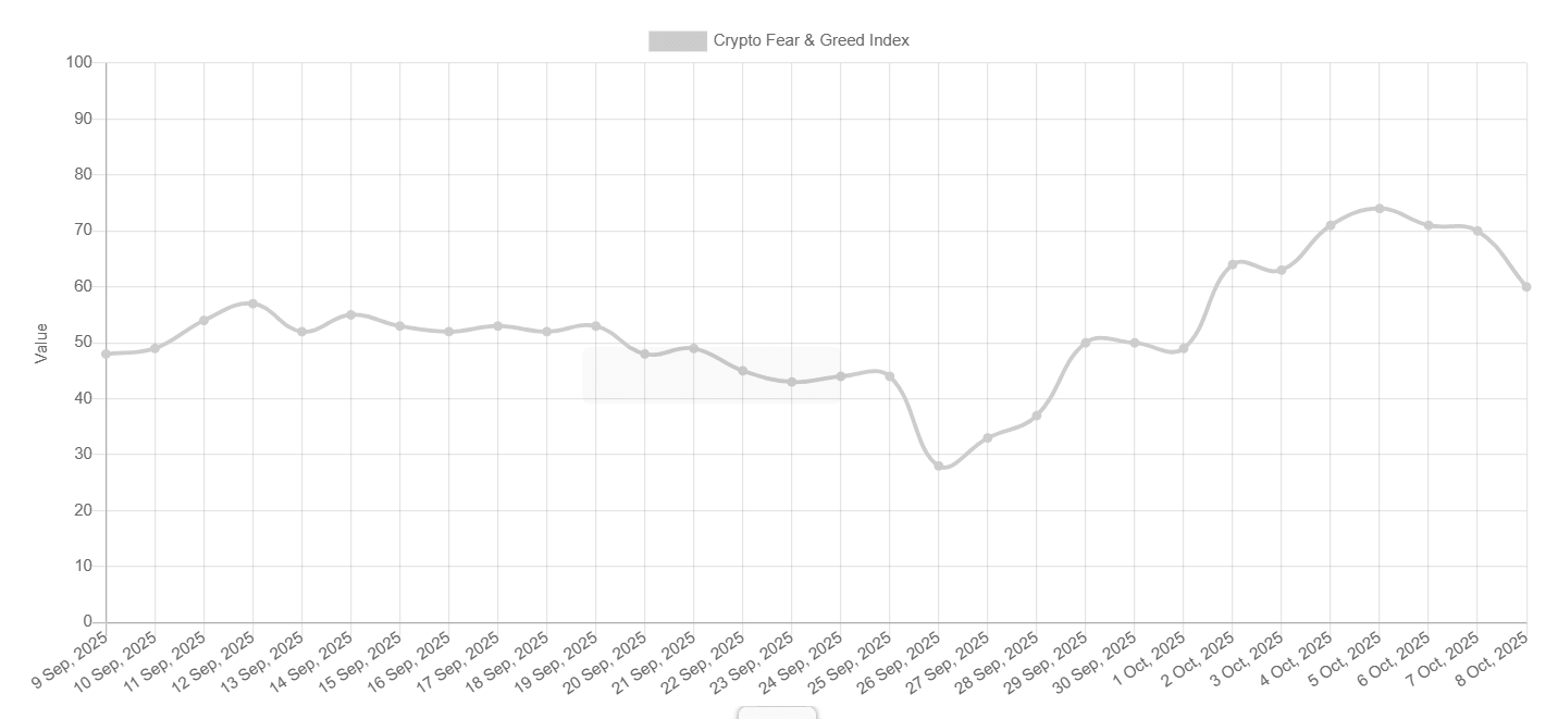 El Índice de Miedo y Codicia cae a 60 el miércoles desde el máximo de 74 del domingo, señalando un enfriamiento del sentimiento de los inversores y un cambio de una fuerte codicia hacia una perspectiva más cautelosa.