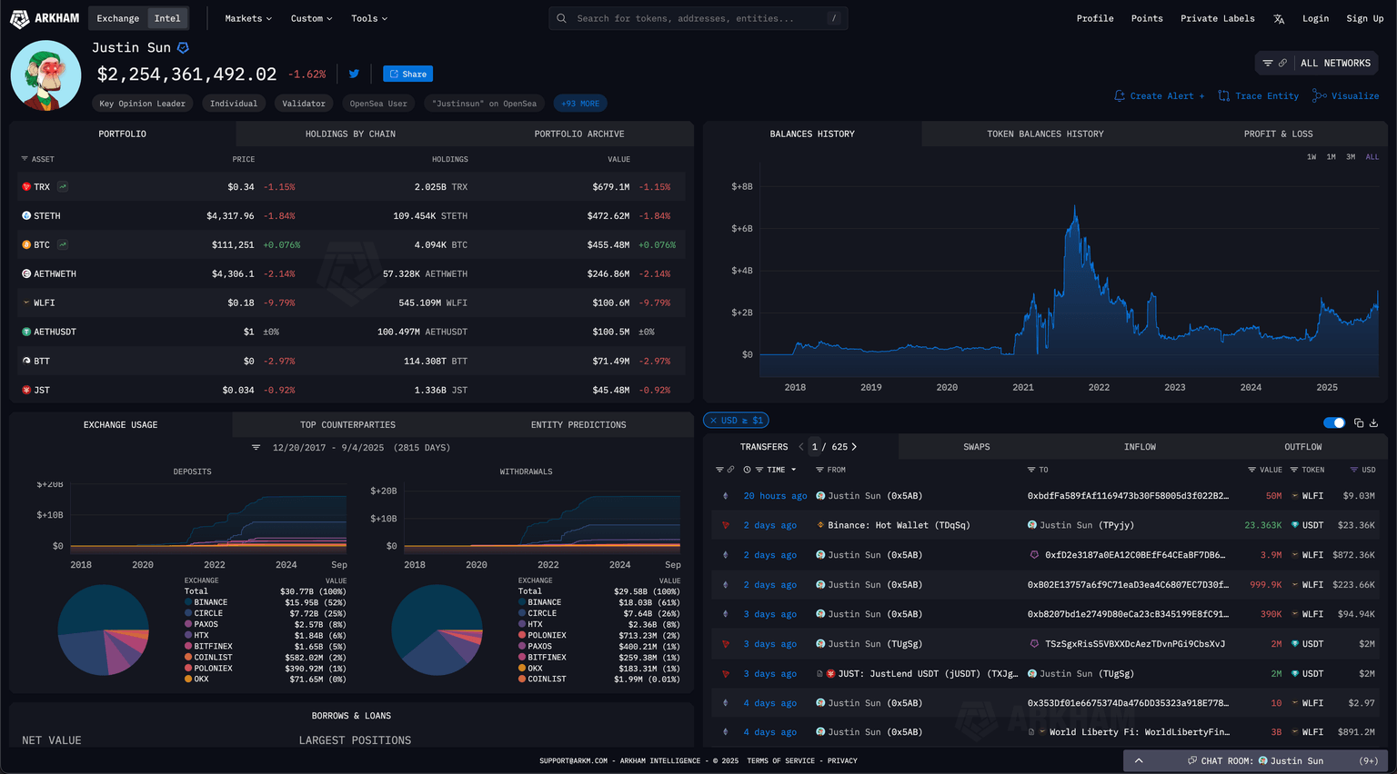 Datos de la dirección de la billetera de Justin Sun. Fuente: Arkham Intelligence