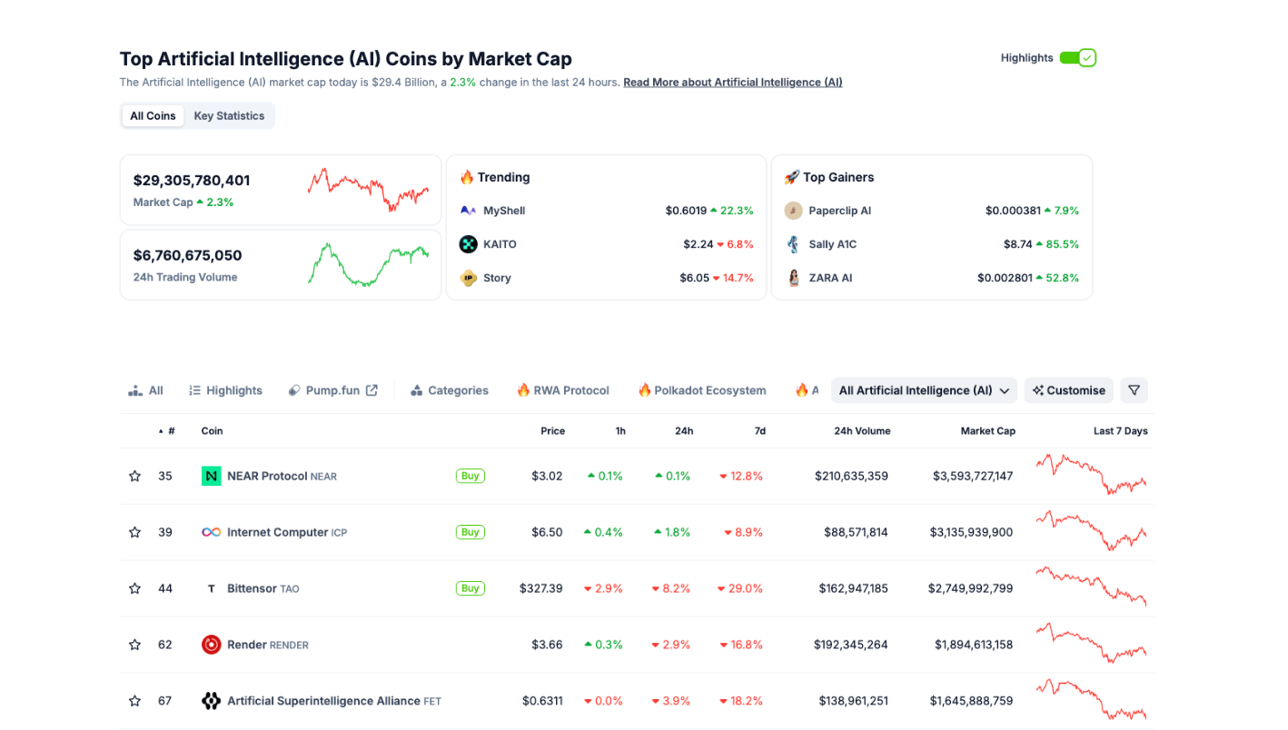 La valoración total del sector de IA alcanzó los 29.4 mil millones de dólares, subrayando el hambre del mercado por aplicaciones de aprendizaje automático de vanguardia en entornos de blockchain.