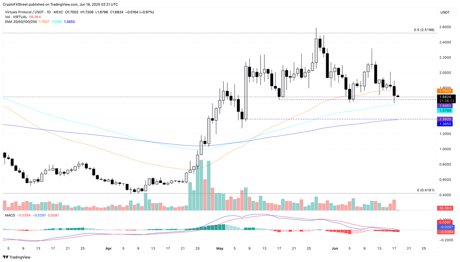 VIRTUAL está cayendo casi un 1% en el momento de escribir el miércoles, extendiendo sus pérdidas en más de un 8% hasta ahora esta semana. El token de agente de IA cierra por debajo del soporte de la EMA de 50 días con una caída del 6.80% el día anterior, presionando el soporte de 1.64$ marcado por el mínimo del 17 de mayo.