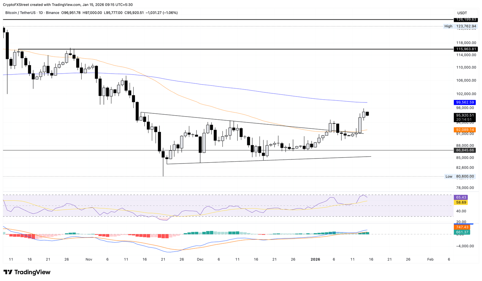 Si BTC termina el día en rojo, podría extender la caída hasta la media móvil exponencial (EMA) de 50 días en 92.089$.
