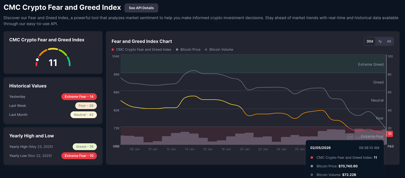 El Índice de Miedo y Avaricia cayó a 11 el jueves, desde 14 el día anterior, adentrándose más en la zona de miedo extremo, que va de 0 a 25.