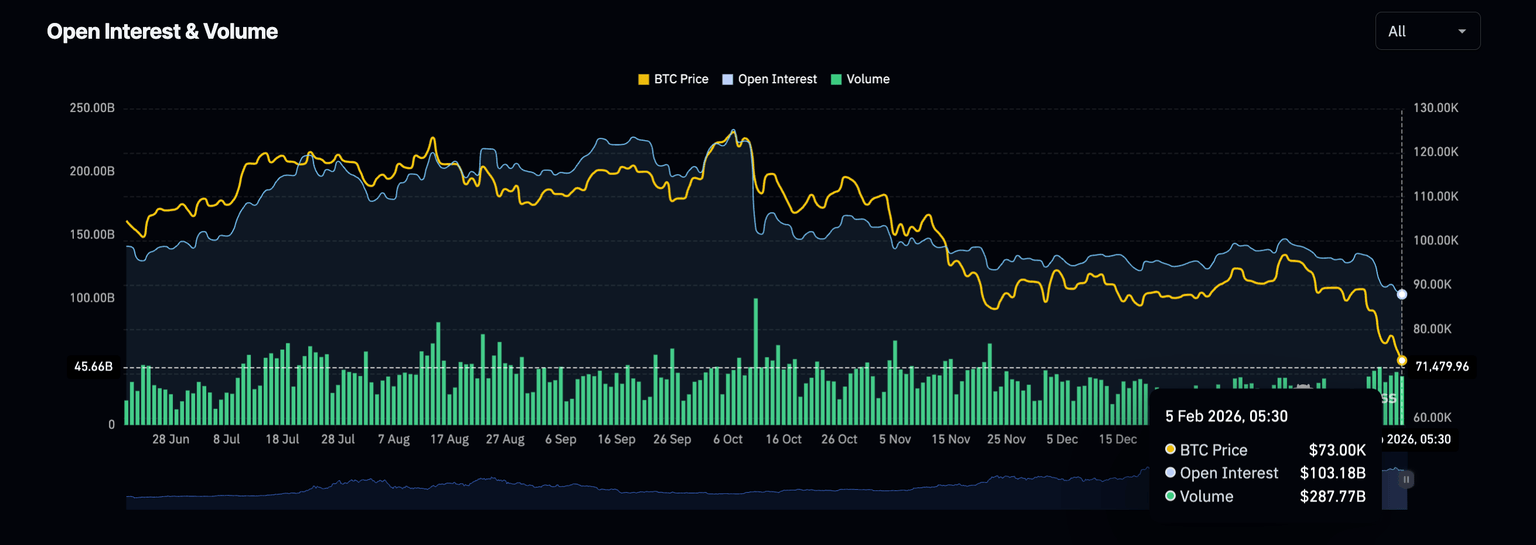 Consistente con las liquidaciones, el Interés Abierto (OI) del mercado de criptomonedas más amplio ha caído a 103.18 mil millones de dólares, desde 105.90 mil millones de dólares el miércoles. Esta extensión de la caída más amplia en el OI refleja salidas de capital en medio de un sentimiento de aversión al riesgo.