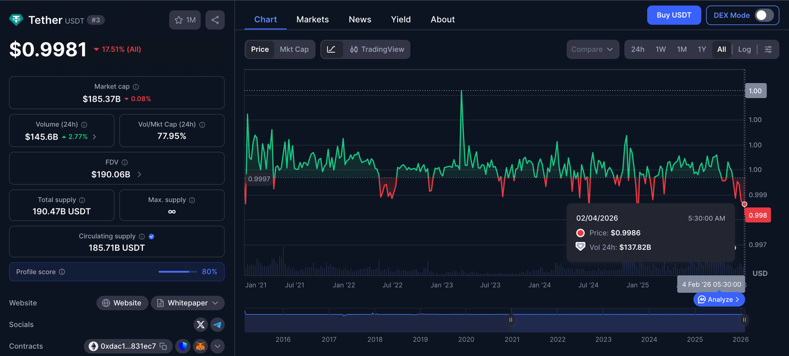 Históricamente, el USDT de Tether ha sufrido depegs múltiples veces, incluyendo una caída del 30% en 2018 y del 6% en mayo de 2022 durante el colapso de Terra Luna. Sin embargo, la sustancial deuda estadounidense mantenida en las reservas de Tether ha ayudado a impulsar los rebotes, y la tendencia continúa hasta 2026.