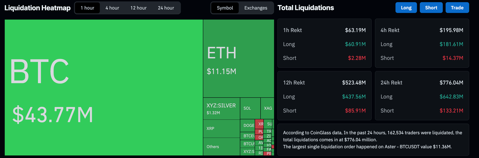Los datos de CoinGlass indican que la caída en las últimas 24 horas eliminó 776 millones de dólares del mercado de criptomonedas, incluyendo 642 millones de dólares en posiciones largas. La mayoría de las liquidaciones de posiciones alcistas confirman el tono bajista en el mercado.