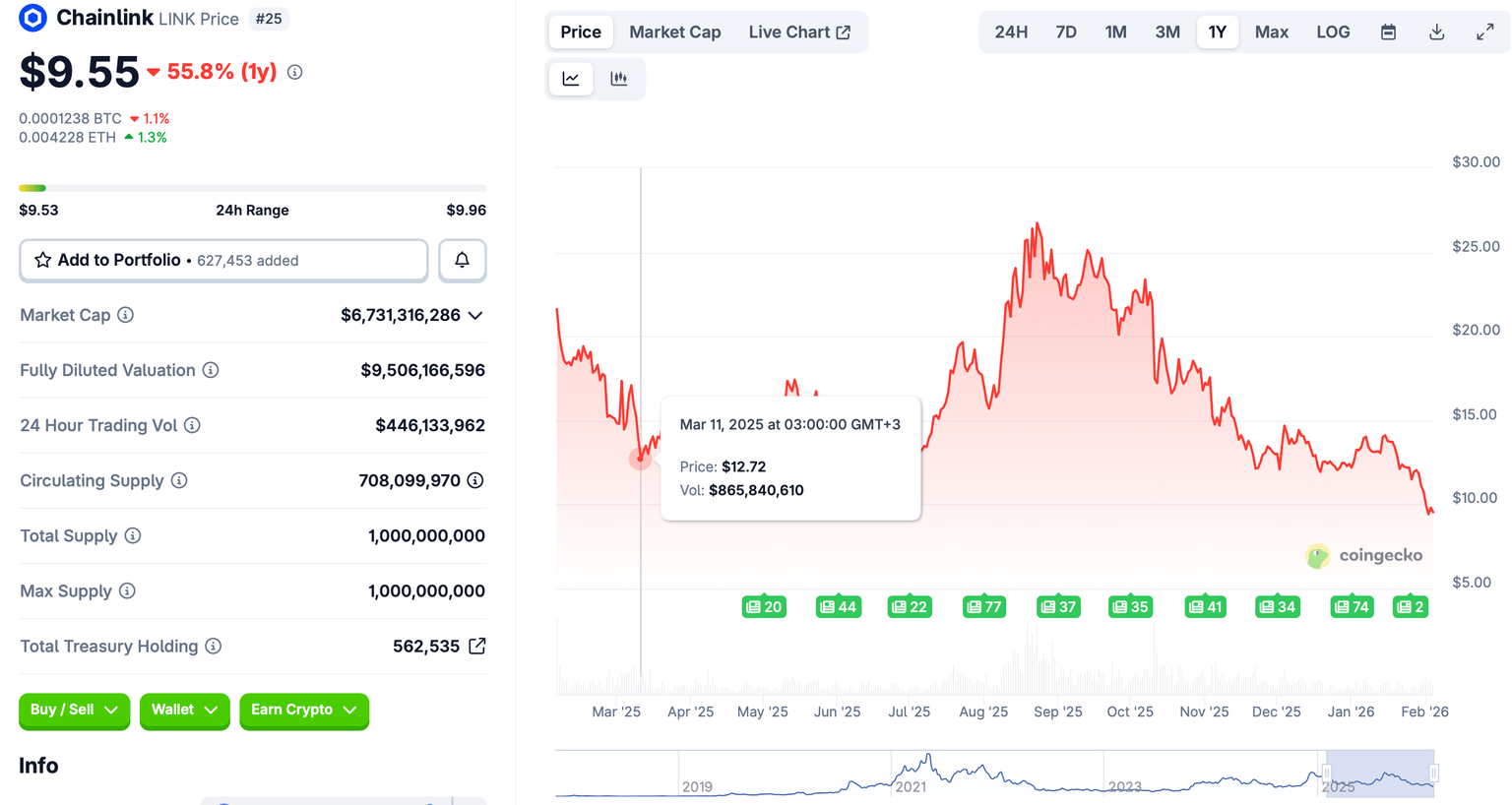 Chainlink se cotiza a 9.55$, con una caída de casi el 3% intradía y del 20% en la última semana. El token oracle ha mantenido una tendencia bajista durante el último año, con rendimientos promedio de -56%, según datos de CoinGecko. LINK se cotizó a un máximo histórico de 52.70$ en mayo de 2021 y desde entonces ha perdido casi el 82% de su valor.