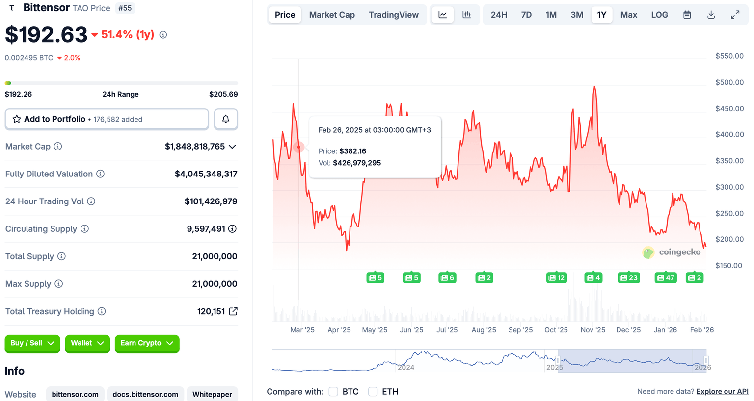El rendimiento de Bittensor durante el último año ha sido en general bajista, con un retorno de -51%. El token se cotiza a 192$ en el momento de escribir este artículo, con una caída del 3.6% en las últimas 24 horas, del 16% en la última semana y del 27% en el último mes. Bittensor tiene una capitalización de mercado de 1.8 mil millones$ y ocupa el puesto 55 en el mercado de criptomonedas.