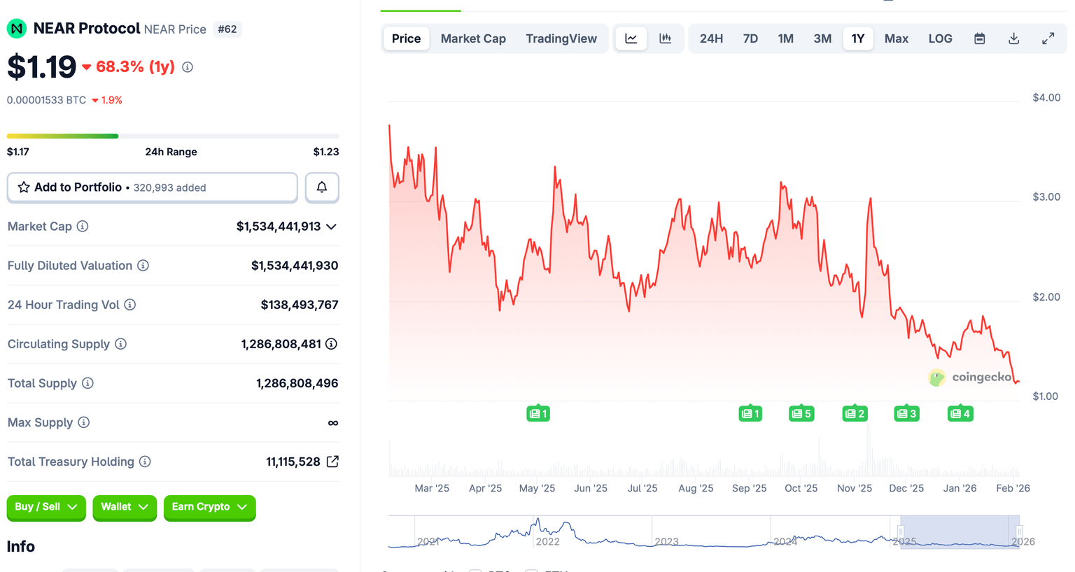 Near Protocol también está en una posición desfavorable, con el mayor retorno negativo de los tres tokens de IA, del 68%. El token se encuentra en 1.19$ en el momento de escribir este artículo, con una caída del 2.7% en 24 horas, del 18% en la última semana y del 31% en los últimos 30 días. NEAR tiene una capitalización de mercado de 1.5 mil millones$ y ocupa el puesto 62 en el mercado de criptomonedas.