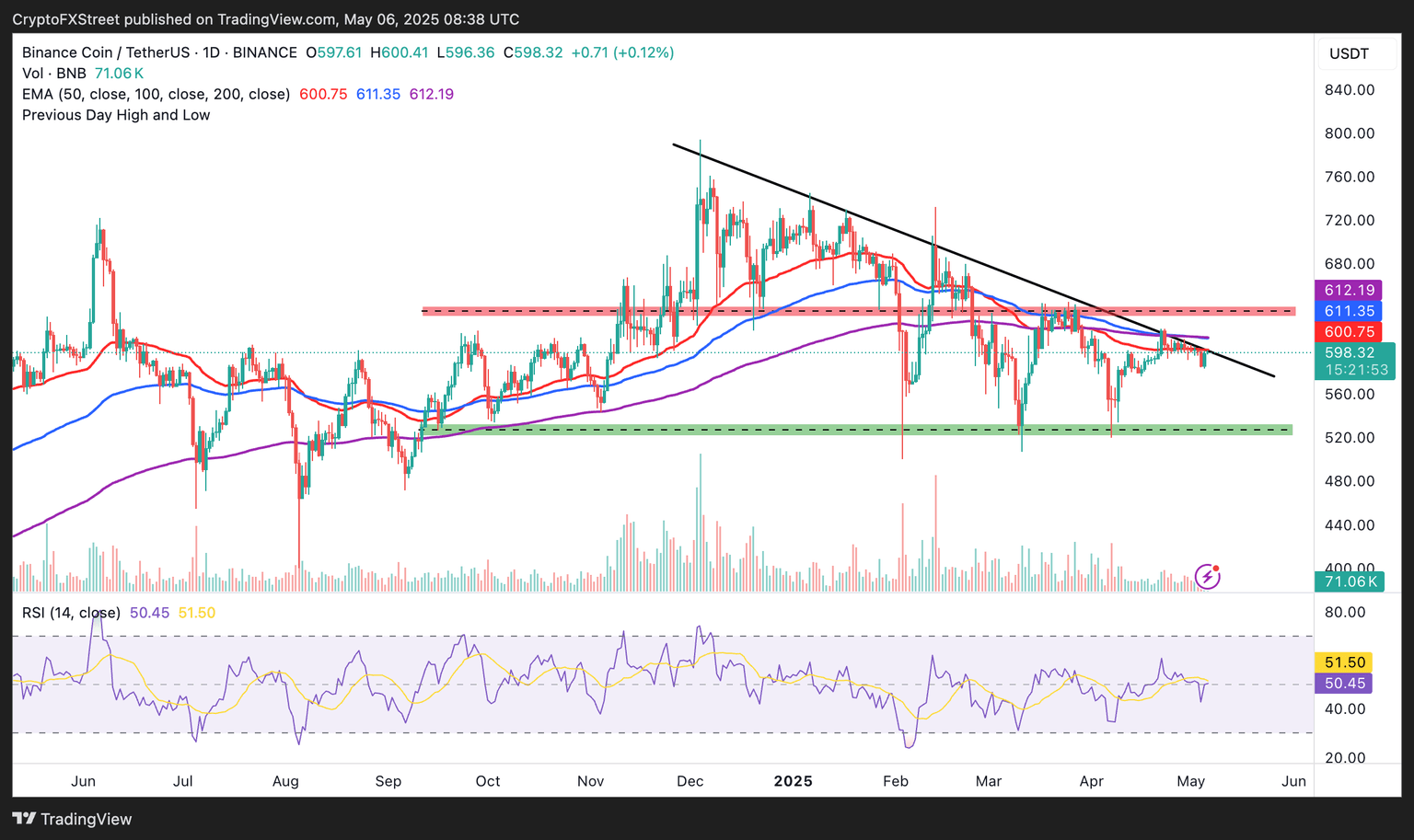 - El precio de BNB refuerza su perspectiva alcista, buscando una ruptura por encima de la media móvil exponencial (EMA) de 50 días, coincidiendo con una resistencia de línea de tendencia descendente.