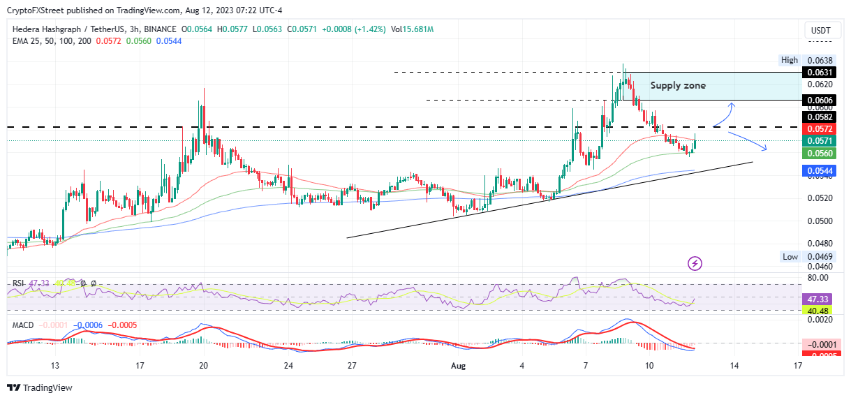 El precio de Hedera (HBAR) se enfrenta actualmente a la EMA de 50 días en 0.0572$, un nivel de congestión de proveedores que determinará el próximo movimiento de HBAR. Si la altcoin hace un cierre decisivo de velas de 3 horas por encima de este nivel, podría completar la recuperación del 5% a la zona de oferta por encima.