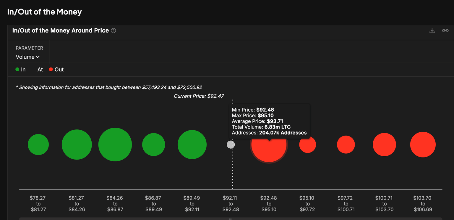 - Litecoin enfrenta un pesado cluster de resistencia entre 92$ y 95$, donde más de 204.000 direcciones compraron previamente 6.83 millones de LTC.
