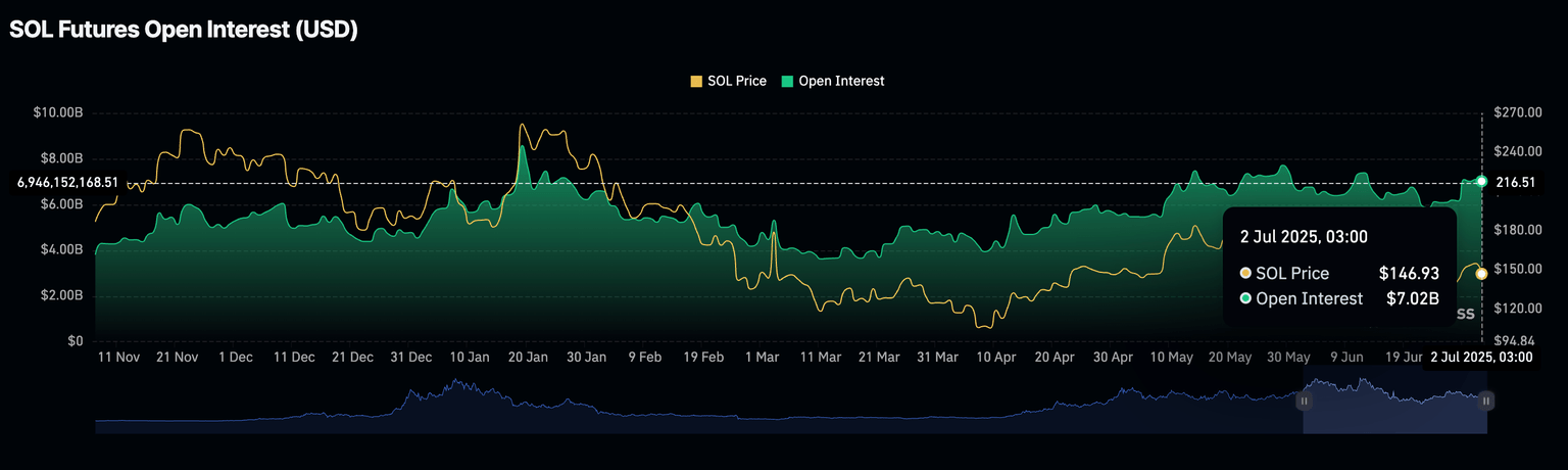 El interés en SOL parece ser constante, según los datos de CoinGlass sobre el Interés Abierto (OI) de futuros, que promedió aproximadamente 7.000 millones de dólares el miércoles. El interés abierto es el valor de todos los contratos de futuros y opciones que no han sido liquidados o cerrados. Se puede utilizar para medir el sentimiento del mercado, con un aumento constante que indica un creciente apetito por el riesgo.