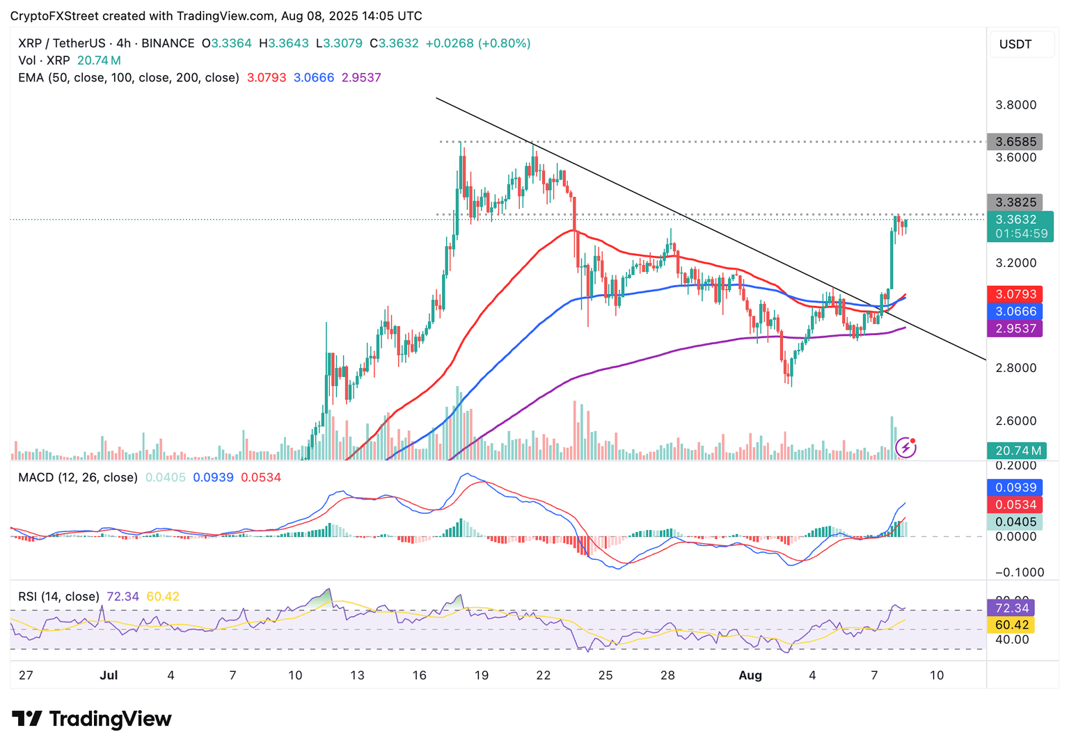 - XRP rompe 3.38$, respaldado por un sentimiento positivo del mercado.