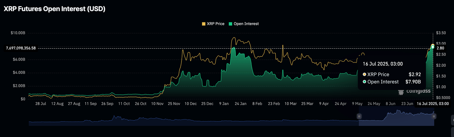 Mientras tanto, el interés de los inversores en XRP se ha mantenido constante en las últimas semanas, con el interés abierto de los contratos de futuros aumentando de 3.54 mil millones de dólares el 23 de junio a 7.9 mil millones en el momento de escribir este artículo.