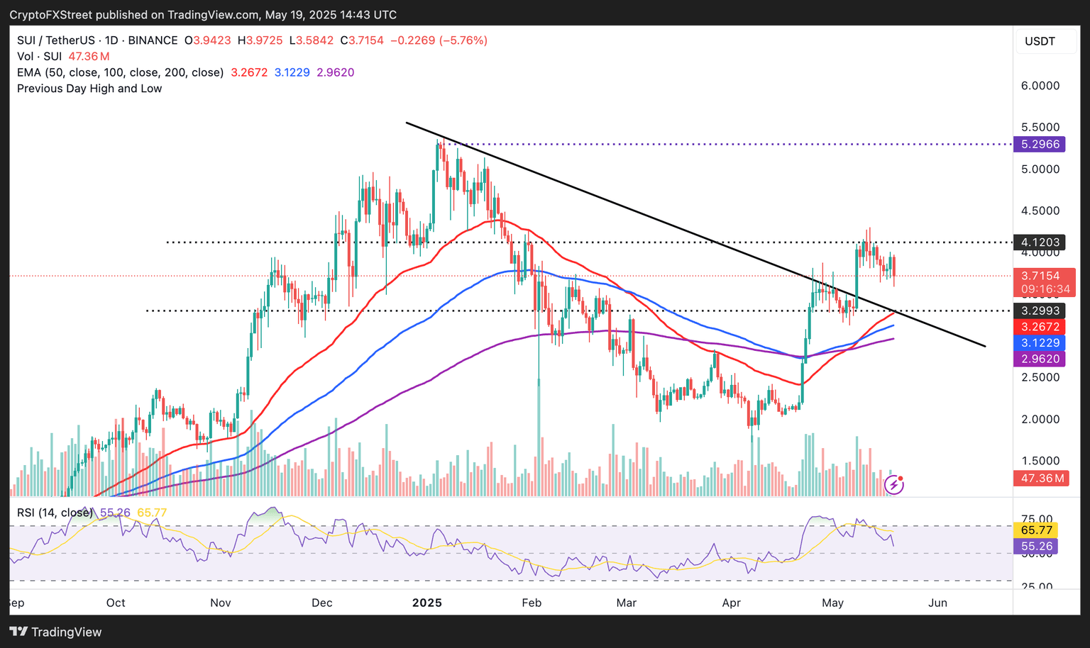 El Índice de Fuerza Relativa (RSI) ha estado en una tendencia a la baja pronunciada, acercándose a la línea media de 50 después de alcanzar niveles de sobrecompra en 75.53 el 8 de mayo. Este descenso constante se alinea con el retroceso de Sui desde su pico de 4.30$, sugiriendo que los vendedores aún tienen una ventaja a corto plazo.
