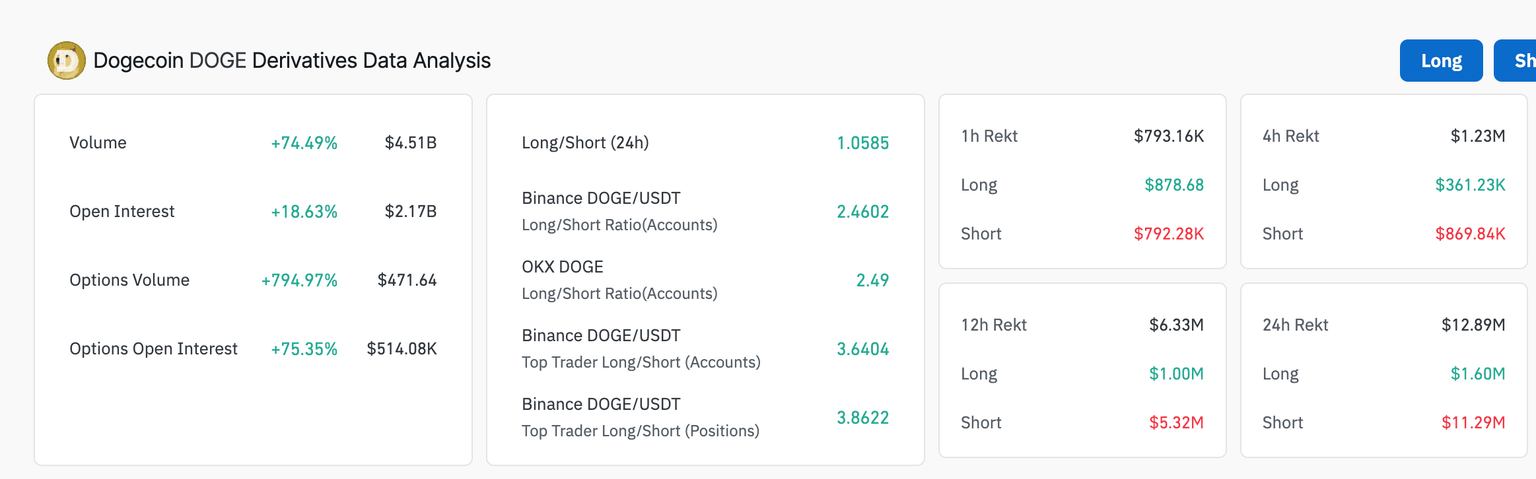 El aumento del 18% en el interés abierto (OI) hasta 2.17 mil millones de dólares sugiere un creciente interés de los traders en la mayor moneda meme por capitalización de mercado. En otras palabras, la tendencia alcista en el precio de DOGE anima a los inversores a buscar exposición, apostando por un repunte más prolongado.