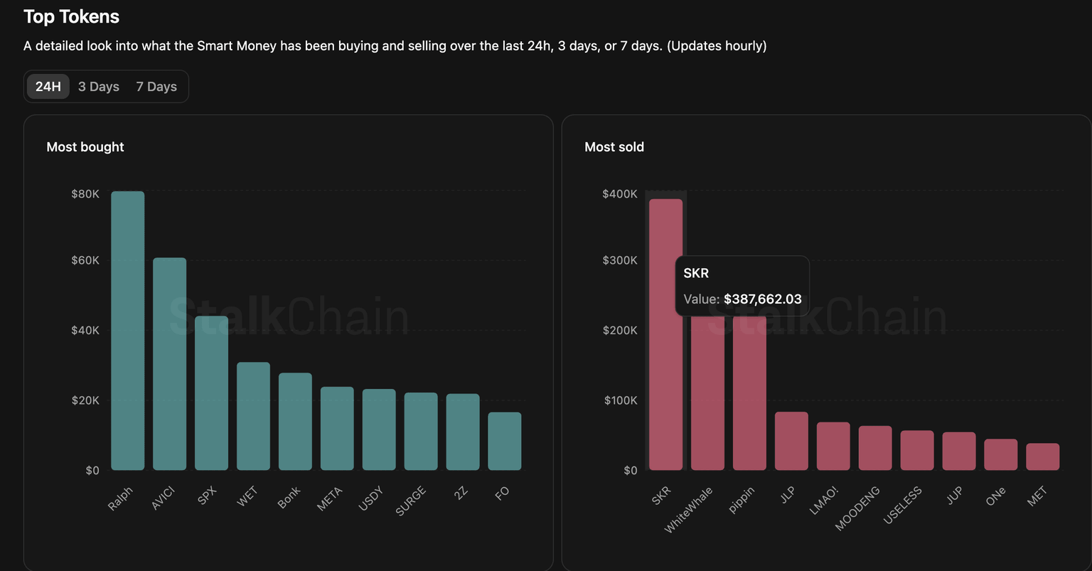 Según Stalkchain, el token SKR es una de las criptomonedas más vendidas por el dinero inteligente en las últimas 24 horas, por un valor de 387.662$. Esto sugiere que algunos grandes inversores están deshaciéndose de sus tenencias de SKR en lugar de staked para obtener recompensas adicionales, mientras que la demanda minorista absorbe la presión.