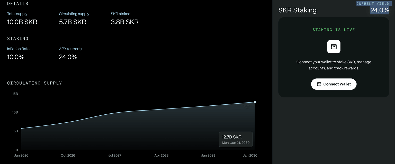 En línea con la expansión del ecosistema, el alto staking de SKR para ganar recompensas refleja una mayor confianza de los usuarios. De los 5.7 mil millones de suministro circulante, 3.8 mil millones de tokens SKR están staked, lo que representa más del 50%. A pesar de la tasa de inflación del 10%, que aumentaría el suministro total a 12.7 mil millones, la demanda a corto plazo pasa por alto el riesgo.