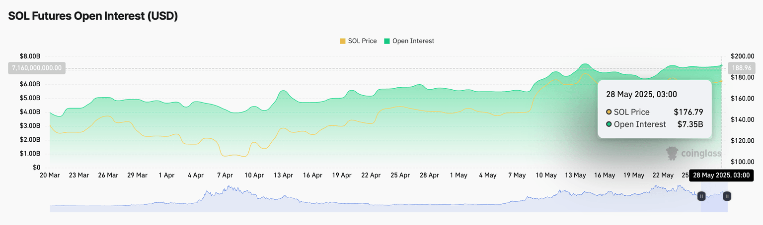 El rendimiento de Solana en el microentorno, particularmente en el mercado de derivados, señala un interés constante y apuestas crecientes sobre el precio, alcanzando niveles más altos. Los datos de CoinGlass muestran que el Interés Abierto de futuros de SOL se está consolidando actualmente en alrededor de 7.35 mil millones de dólares después de aumentar desde 6.4 mil millones de dólares registrados el 20 de mayo.