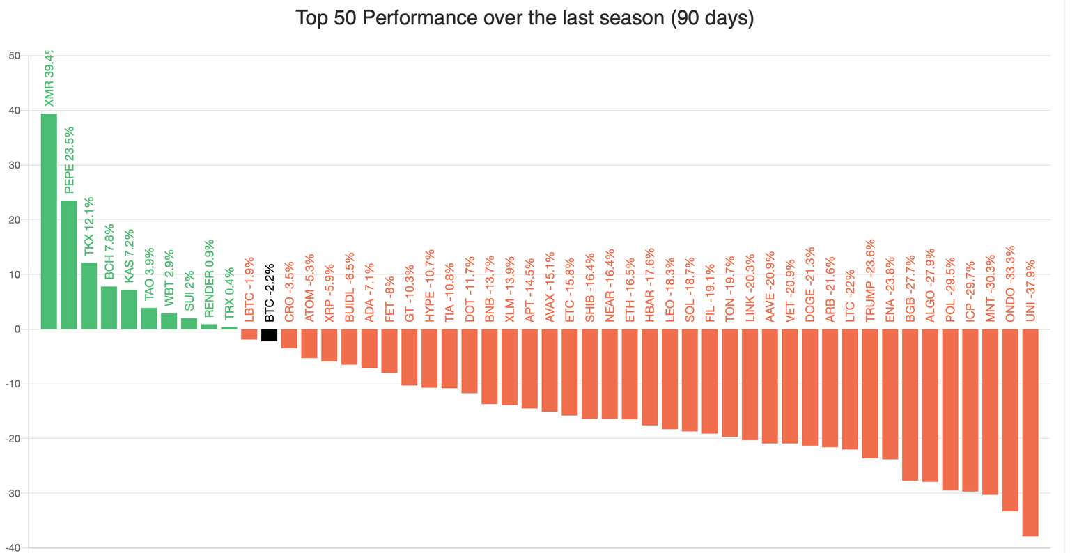 Rendimiento de las 50 principales monedas en 90 días | Fuente: blockchaincenter.net