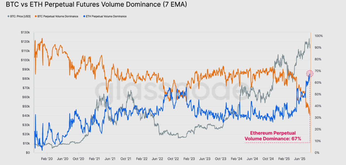 Dominio del Volumen de Futuros Perpetuos de BTC vs ETH. Fuente: Glassnode