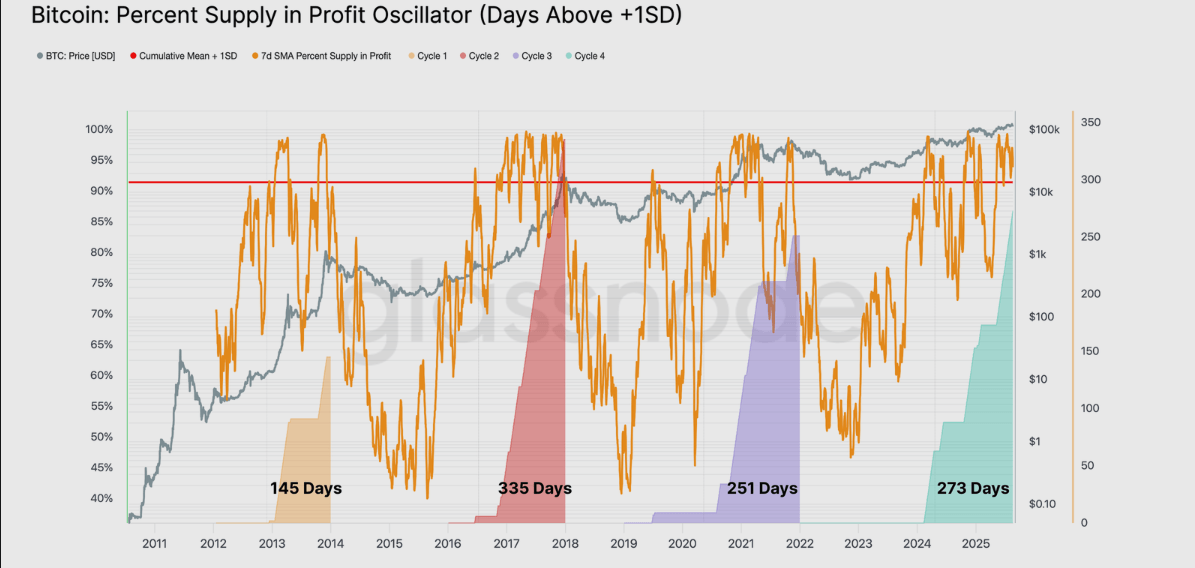 El informe destaca que el rendimiento actual de Bitcoin muestra similitudes con los ciclos de 2015-2018 y 2018-2022. Una medida para evaluar esta correlación es el número de días que la oferta circulante de BTC ha permanecido por encima de la banda de +1 desviación estándar, escribieron los analistas de Glassnode. Hasta ahora, el período actual se ha extendido a 273 días, marcando la segunda racha más larga registrada, detrás de los 335 días vistos en el ciclo de 2015–2018.