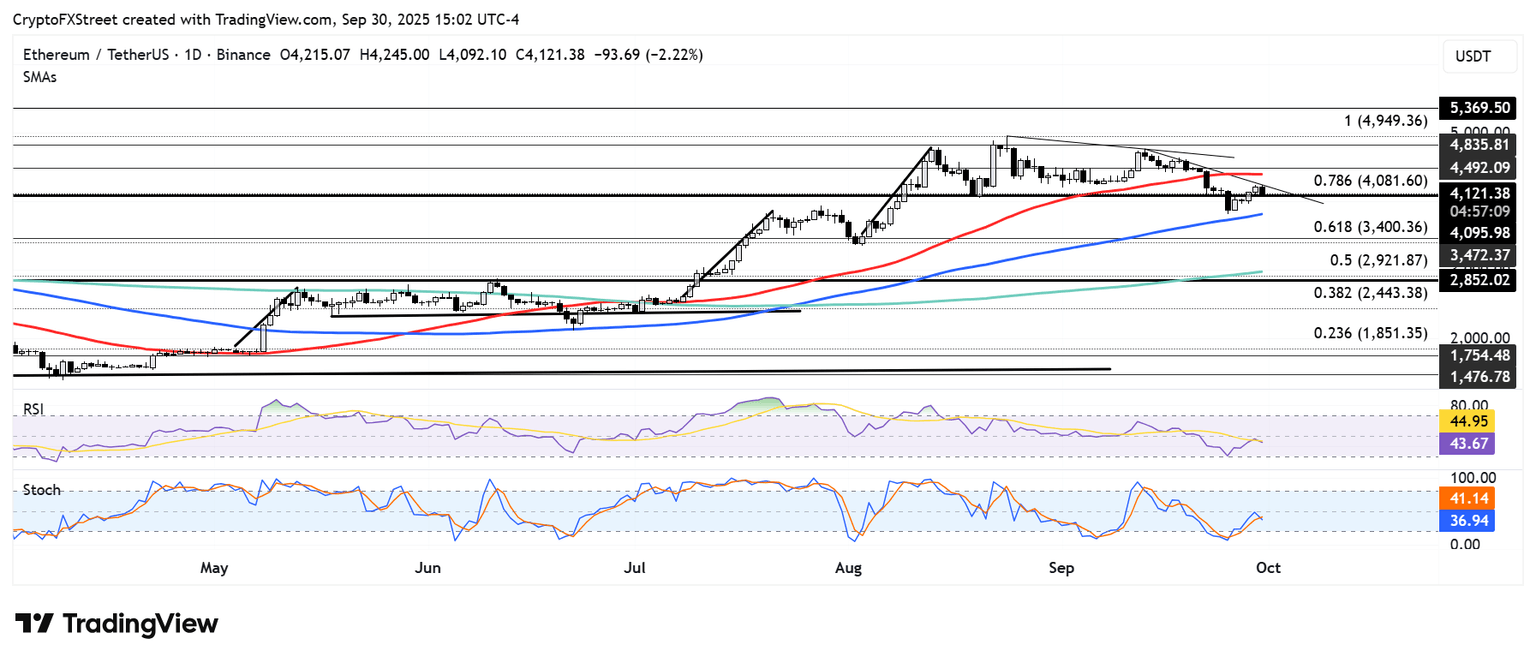 ETH vio un rechazo en la resistencia de la línea de tendencia descendente, que se extiende desde el 13 de septiembre, después de una recuperación durante el fin de semana. Tras el rechazo, la principal altcoin está probando los 4.100$, un nivel donde los bajistas iniciaron presión de venta en varias ocasiones en 2024.