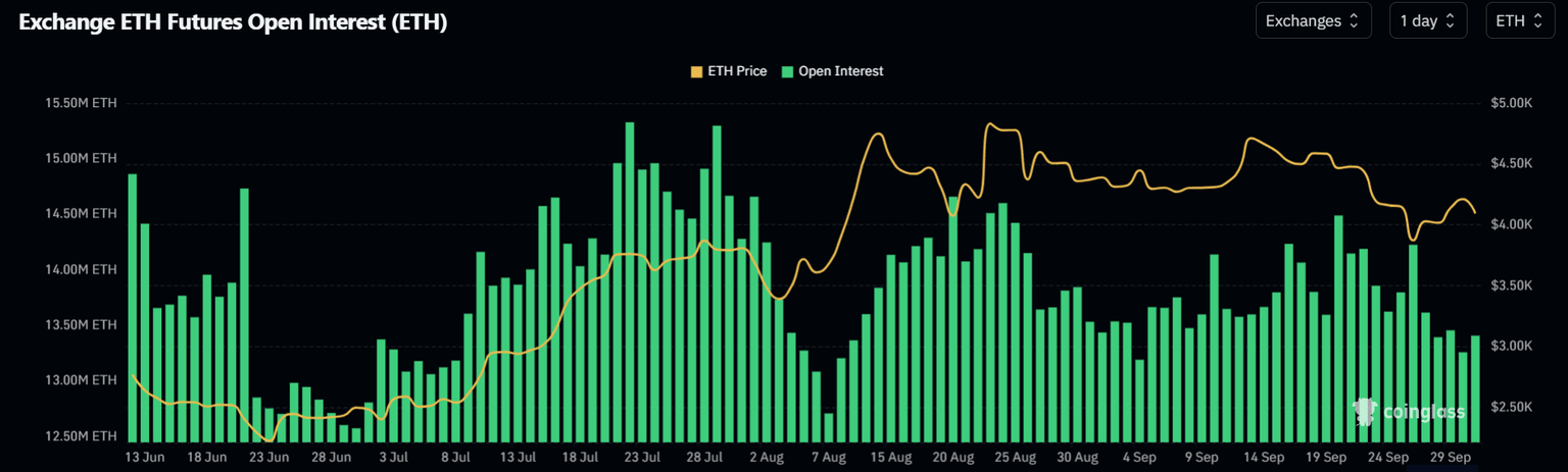 Sin embargo, las señales de cautela son evidentes en el mercado de futuros, donde el interés abierto de Ethereum se ha mantenido moderado desde el 26 de septiembre, según datos de Coinglass. La falta de recuperación en el interés abierto de Ethereum —la cantidad total de contratos activos o no liquidados en su mercado de futuros— indica una renuencia de los operadores a asumir apalancamiento, especialmente después de las fuertes liquidaciones de la caída de la semana pasada.