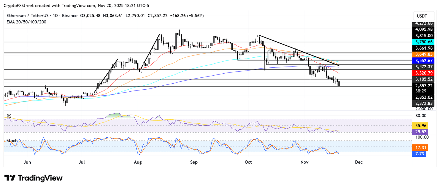 Ethereum Pronóstico del Precio: Ether bajo presión en soporte de 2.850$ mientras FG Nexus vende casi 11.000 ETH